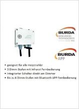 Bluetooth Dimmer macht Infrarotheizstrahler fit für die Steuerung via Smartphone oder Tablet. Der brandneue Burda Bluetooth Dimmer, Burda BTD3 ist sowohl geeignet für alle Burda Heizstrahler Term2000, Smart2000 oder SmartIP24 bis zu einer Gesamtwärmeleistung von 3.000 Watt (3 kW), als auch ideal für Ihren Heizstrahler eines anderen Herstellers bis zu eine Gesamtleistung von insgesamt 3.000 Watt (3 kW).