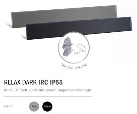 Leistungsstarker Dunkelstrahler komplett ohne Licht. Der Langwellenstrahler RELAX DARK IRC mit 4.500 Watt versorgt die Umluft gleichmäßig mit Wärme gänzlich ohne Lichteffekte. Das flache, geradlinige Design in Schwarz fügt sich elegant und zugleich dezent in jedes Ambiente ein. Schlichte Eleganz und hohe Funktionalität bieten mannigfaltige Einsatzmöglichkeiten in privaten und gewerblichen Innenbereichen. Bitte beachten Sie: Für die Wirksamkeit in Außenbereichen eignen sich aufgrund der langwelligen IR-Strahlung nur absolut windfreie Bereiche.