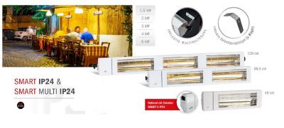 Kompakter SMART IP24 Infrarotstrahler in Weiß, Silber oder Schwarz erhältlich als Einzelgerät oder als MULTI-Gerät mit zwei bzw. drei Heizröhren. Der Heizstrahler mit Spritzwasserschutz IP24 kann in allen geschützten Außenbereichen installiert werden. Der große Reflektor sorgt jederzeit für eine optimale Wärmeabgabe. Die LOW GLARE-Röhre gibt ein angenehmes Licht mit reduziertem Rotlicht. Die Heizung ist mit Montagewinkeln für die Wand- und Deckenmontage ausgestattet, kann aber auch mit passenden Stativ (BHSS) freistehend aufgebaut werden.