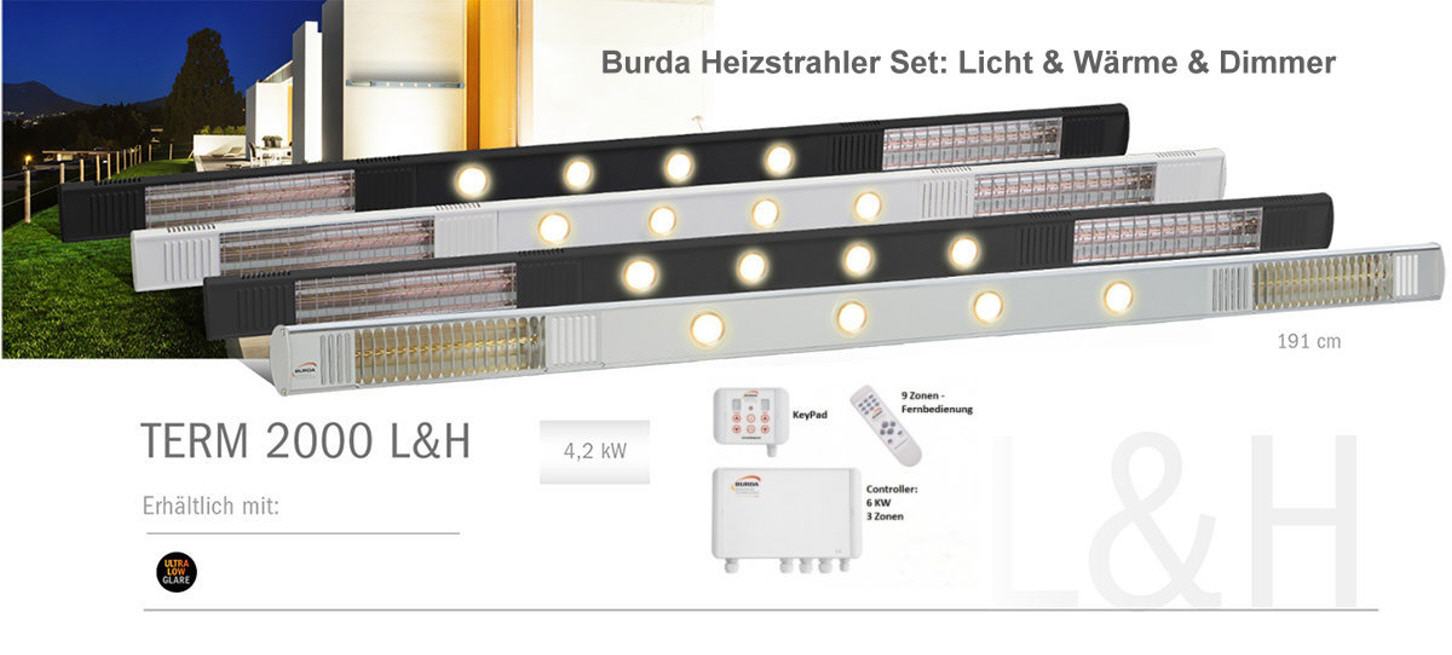 Burda Term Low Glare L&H 180 - Infrarot Heizstrahler TERM 2000 IP65 1,65 KW. Behagliche Wärme und um 180 drehbares Licht. Mit dem Infrarotstrahler, Burda L&H URLH1765 haben Sie sofort Beleuchtung und Wärme für... 759,00 EUR (incl. 19% USt. zzgl. Versand)