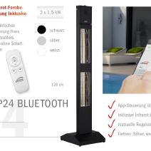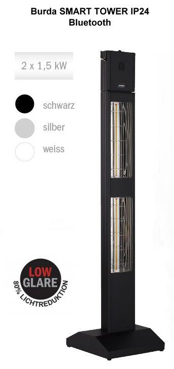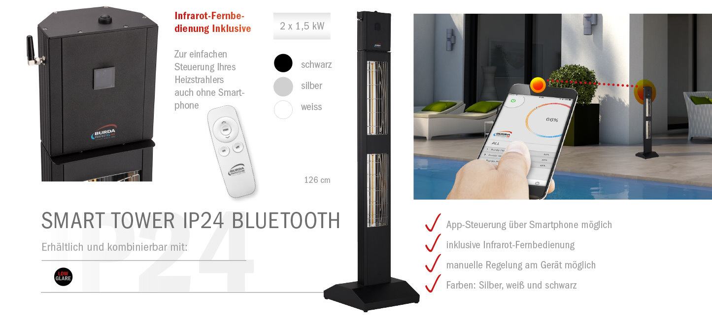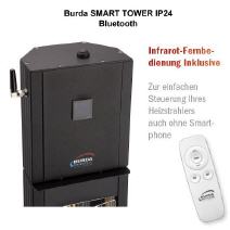 Der designstarke SMART TOWER Bluetooth wartet mit gleich zwei neuen Features auf. Mit einer Bluetooth Schnittstelle kann er ab sofort bequem mit der kostenlosen BURDA APP (IOS und Android) über das Smartphone und Tablet bedient werden. Eine im Set enthalten Infrarot-Fernbedienung sowie eine Schalterfunktion am Gerät ermöglichen auch alternative Bedienungsvarianten. Neu ist auch die Aufwertung des Heizstrahlers mit der Spritzwasserschutzklasse IP24, die den vielseitigen, mobilen Einsatz in Außenbereichen erlaubt.