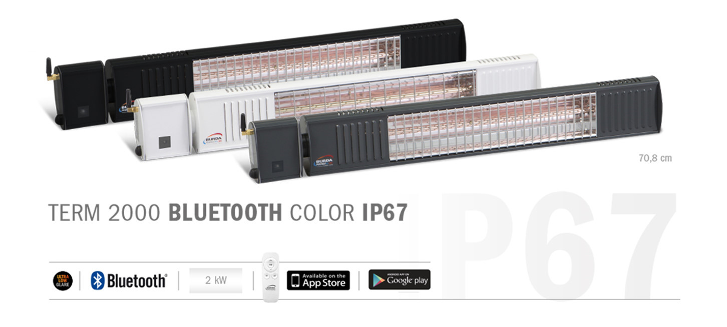 Bluetoothfähiger Infrarotheizstrahler TERM 2000 IP67 Bluetooth COLOR Jetzt in den Farben Weiß, Anthrazit und Schwarz mit bis zu 80 Prozent reduziertem Rotlichtanteil ULTRA LOW GLARE