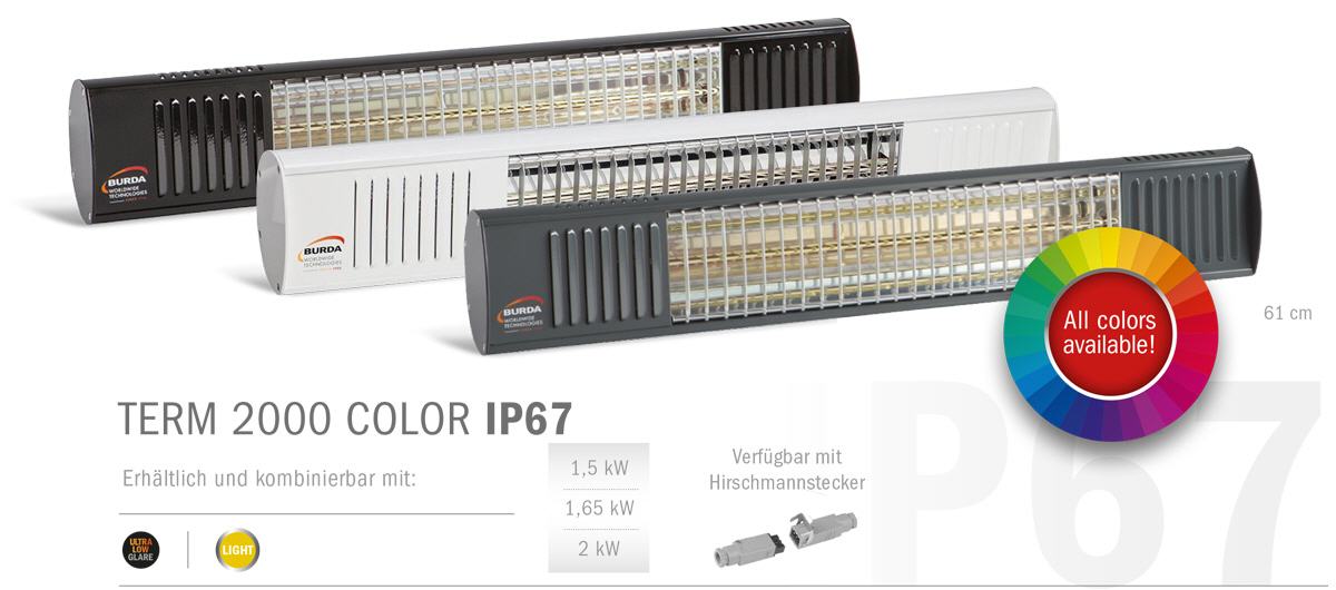 Der Burda Term 2000 IP67, URCAC200V9005 - das farbige Modell in Tiefschwarz (RAL 9005) mit 2.000 Watt oder wahlweise 1650 Watt Heizleistung.