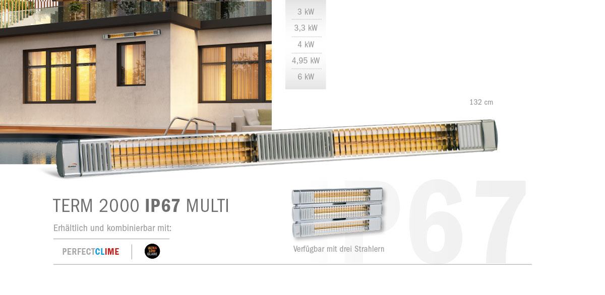Doppelte Heizkraft mit 4.000 Watt! Der leistungsstarke TERM2000 MULTI IP67 ist ein hochkarätiger Terrassenheizstrahler, der mit einem Wärmebereich von ca. 30 qm auch größere Außenflächen erwärmt. Herzstück des absolut wasserdichten Strahlers sind zwei ULTRA LOW GLARE Goldröhren mit 80% weniger Rotlichtanteil und einer Betriebslaufzeit bis zu 5.000 Stunden. Das pulverbeschichtete Aluminiumgehäuse ist wasserdicht (IP67) und überdauert problemlos Schnee, Eis und Regen - selbst in ungeschützten Außenbereichen.