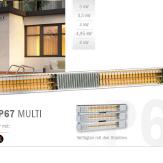 Dreifache Heizkraft mit 6.000 Watt in designstarker Qualität! Der leistungsstarke TERM2000 MULTI IP67 ist ein hochkarätiger Terrassenheizstrahler, der mit einem Wärmebereich von ca. 45qm auch größere Außenflächen erwärmt. Herzstück des absolut wasserdichten Strahlers sind drei ULTRA LOW GLARE Goldröhren mit 80% weniger Rotlichtanteil und einer Betriebslaufzeit bis zu 5.000 Stunden. Das pulverbeschichtete Aluminiumgehäuse ist wasserdicht (IP67) und überdauert problemlos Schnee, Eis und Regen - selbst in ungeschützten Außenbereichen.