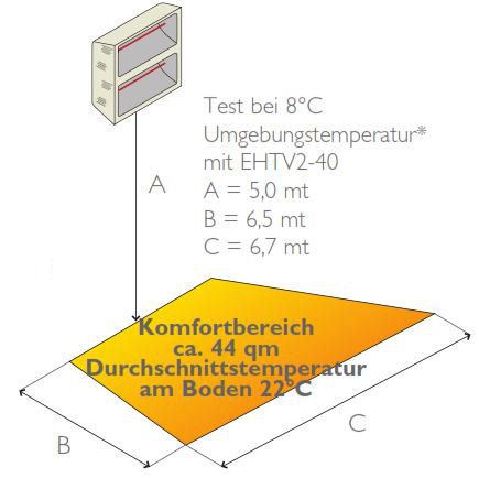 Der Helios Titan ist Testsieger mit Sofortwärme bis auf 5 Meter. Kein anderer Strahler projektiert 20°C auf 43m2 auf 5 m Entfernung. Großer Vorteil der Infrarotstrahler ist, dass einerseits nur beheizt wird wenn effektiv Wärme benötigt wird und andererseits 100% der Wärme sofort nach dem Einschalten des Gerätes spürbar ist.